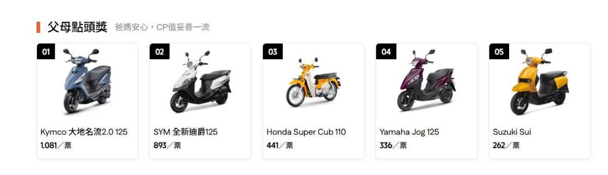 「父母點頭獎」目前由Kymco 大地名流2.0 125以1,081票暫居第一,SYM 全新迪爵125(893票)緊追在後,兩者差距不到200票,競爭相當激烈。