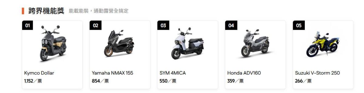 跨界機能獎由Kymco Dollar以1,152票領先,展現極高支持度。Yamaha NMAX 155則以854票穩居第二,兩者差距約300票。
