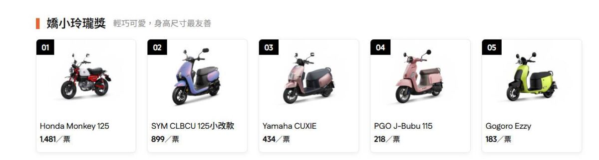 在嬌小玲瓏獎中,Honda Monkey 125以1,481票大幅領先,幾乎呈現「獨走」局面。第二名SYM CLBCU 125小改款(899票)雖有不錯表現,但差距已將近600票,也使得逆轉難度逐漸升高。後續Yamaha CUXiE、PGO J-bubu 115與Gogoro EZZY則呈現穩定但無法突破的票數分布。