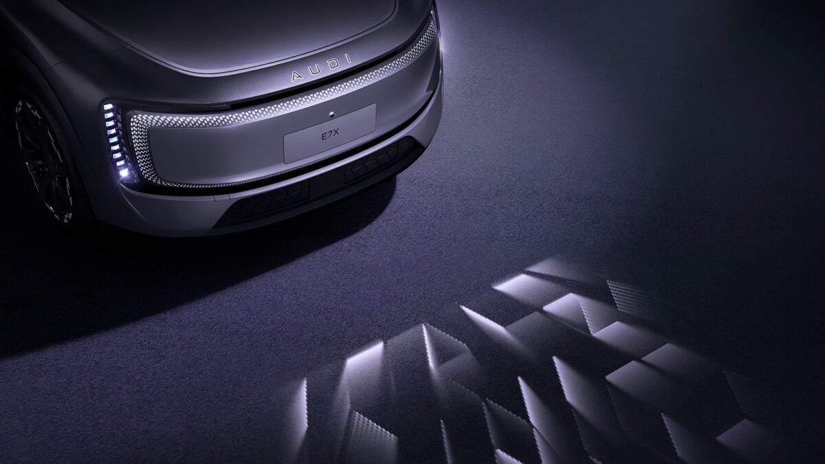 作為中國「AUDI」品牌成立後所推出的第二款新車,E7X跟E5 Sportback一樣基於Audi與上汽集團共同開發的專屬智慧數位平台打造,並導入相同的設計語彙,包括前後環形光帶、取代四環廠徽的「AUDI」發光標誌,位於環形光帶兩側的直立式頭燈組更內建百萬級像素的DLP數位投射功能。