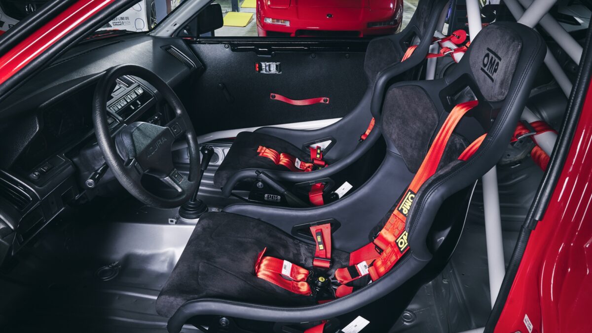 外觀則採用1980年代經典Rio Red Metallic塗裝,搭配Quartz Silver簡化內裝與引擎室,營造純粹賽道氛圍。車內配置亦相當硬派,包括由Blackbird Fabworx打造的防滾籠,以及OMP賽車座椅與六點式安全帶,完整展現賽道取向設定,輪圈選用Mugen 14吋輕量化設計,搭配Yokohama ADVAN A050半熱熔胎,進一步強化抓地力與操控極限。