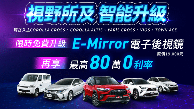 Toyota感謝廣大消費者長期的支持與肯定,2026年1至3月底累積銷量近3萬台 (市占率30.6%),為進一步回饋消費者,Toyota於4月份推出「視野所及 智能升級」活動,即日起入主Corolla Cross、Corolla Altis、Yaris Cross、Vios以及Town Ace限時免費升級E-mirror電子後視鏡,再享最高80萬0利率。