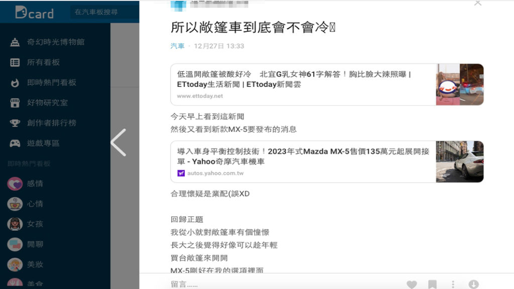 有熱愛敞篷車的網友就在網路上求問,在天氣溼冷的台灣開敞篷車到底好不好?原po表示,從小就對敞篷車很憧憬,長大後覺得該趁年輕買一台開開,認為MX-5很適合自己。不過在路上也看天冷或下雨時,有人依舊是開著篷上街,不知車主在想甚麼?是不是有暖氣、電熱椅就不怕冷?更聽說行進間下雨天開敞篷,車內是淋不到雨的,求問敞篷車可給予解答!