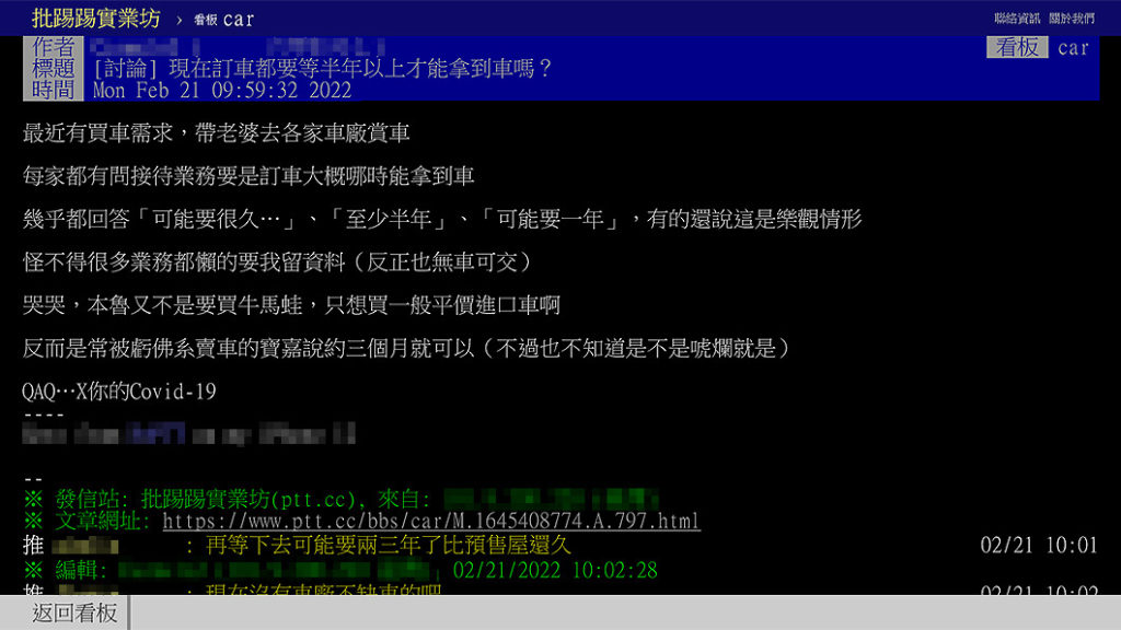 另外還有人提醒發文者,等待還不是最大的問題:「疫情期間供應鏈跟勞動力都不穩定,這段時間做的車子最好不要買,品質有問號。以後買二手車,Covid混亂時期的車子也應該避開。」不過這樣的認知並沒有實際證據支持,可能要等2021與2022年新車可靠度調查數據出爐,才能夠肯定。
