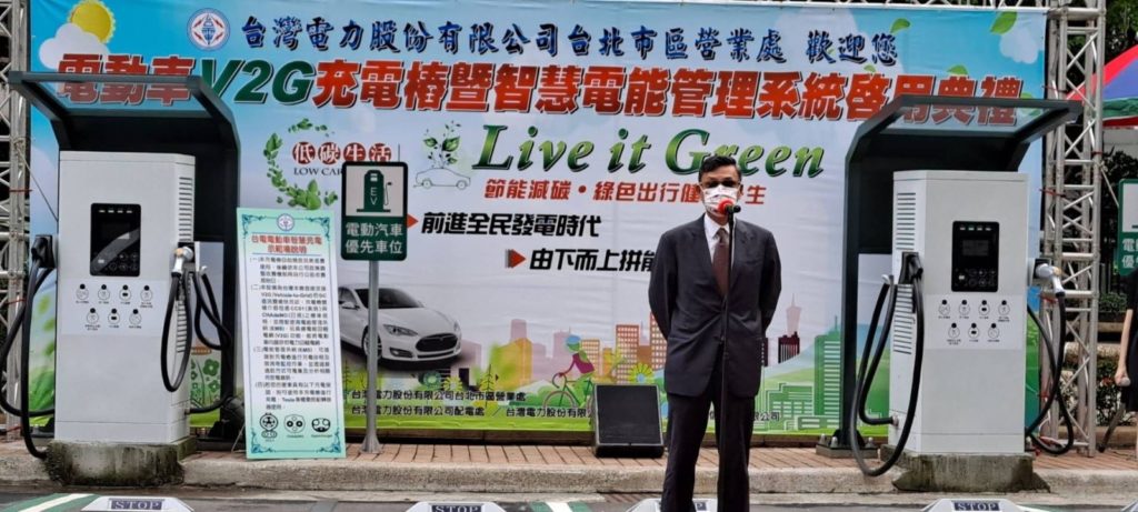 除了《地球黃金線》有報導介紹到某幾款電動車將能化身「大型行動電源」,擔任停電時的應急電力之外,台電在2021年8月4日啟用了與遠傳聯手建置的台電本島首座V2G智慧充電示範場,地點位於台北市區處民眾洽公停車場(基隆路四段75號)。