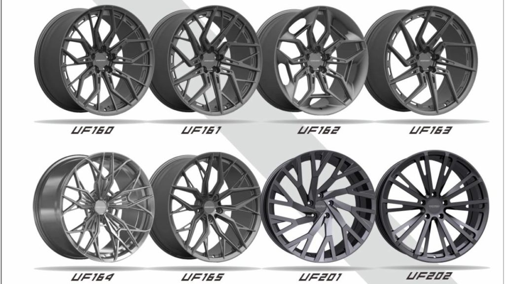 305Forged的UF160、UF161、UF162、UF163、UF164與UF165都是今年第一季在台上市的新產品,屬於單片鍛造式鋁圈,對於想預算型買家又想入手鍛造框,為一不錯且親民的選擇。其中,UF160、UF161、UF164與UF165皆為五輻式樹枝狀樣式,在五條主肋的基礎架構下,透過支肋的連接做出差異化設計,帶來不同的視覺感受。至於UF162為雪花框樣式、UF163為五輻雙肋結構設計成旋風樣式。