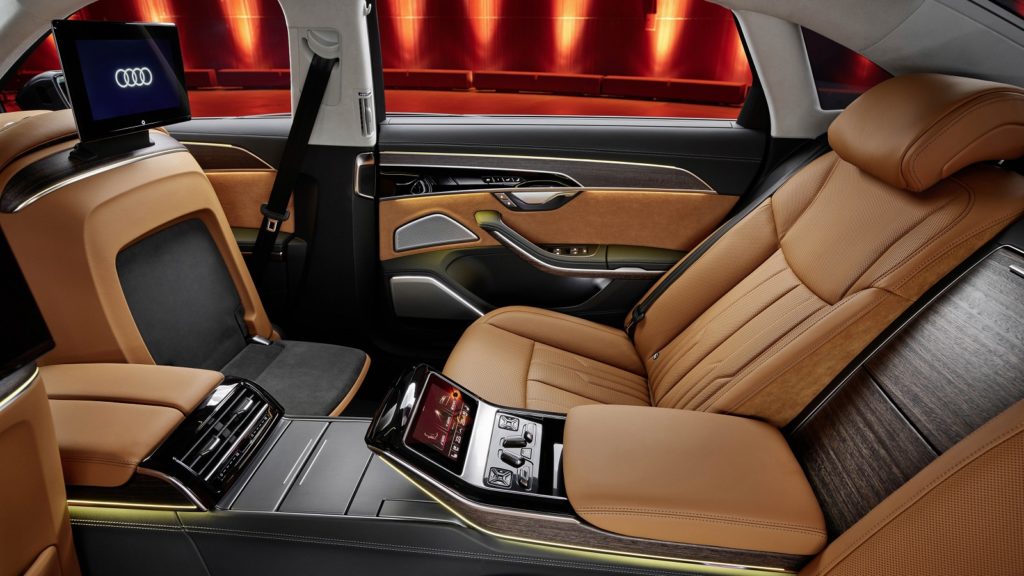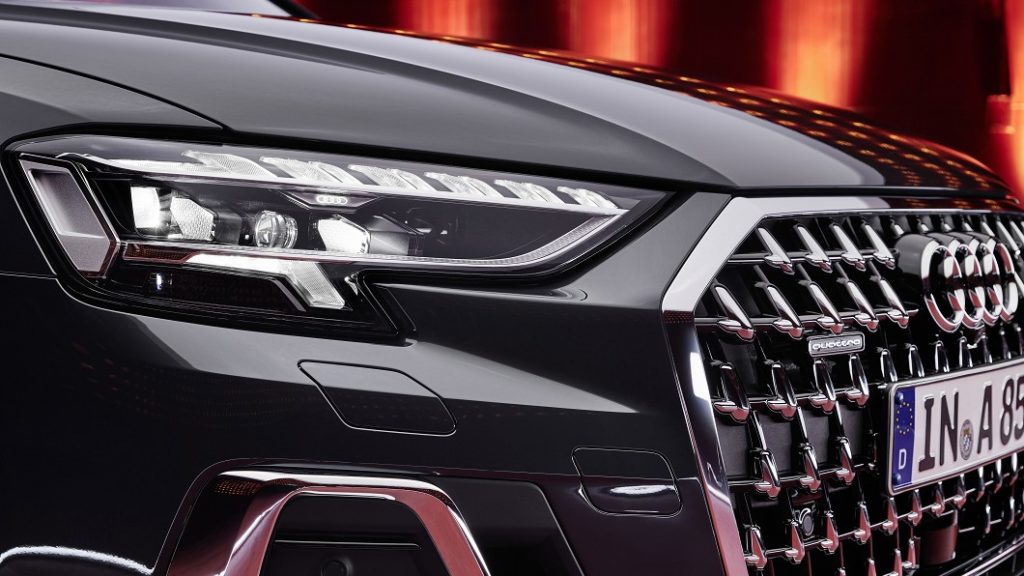配備面上A8全車系標配HD Matrix LED高階矩陣LED頭燈、OLED尾燈、動態顯示方向燈、電動行李箱蓋以及20吋鋁合金輪圈等外觀配備。搭配電動調整真皮多功能方向盤、換檔撥片、感應式鑰匙、多採氣氛燈、後窗與後擋電動遮陽簾、電動輔助車門關閉、雙前座電動調整與冷熱通風座椅、後座電動調整座椅,還有四區恆溫空調、中文衛星導航、無線Apple CarPlay智慧型手機連結與Bang & Olufsen環繞音響等配備。