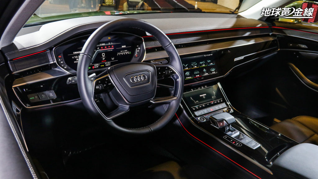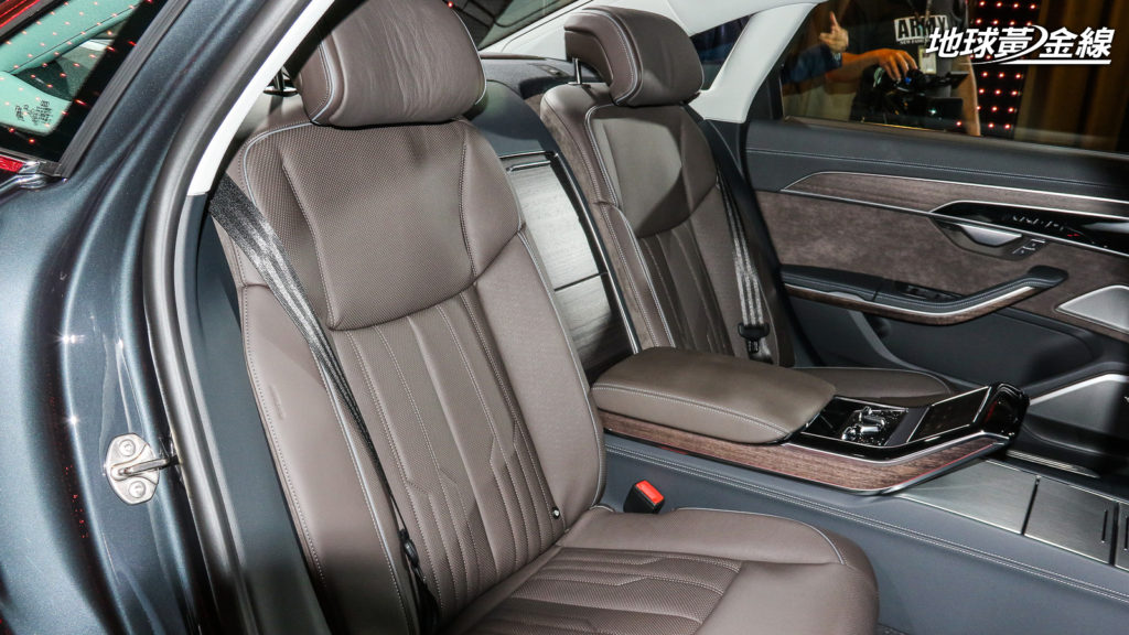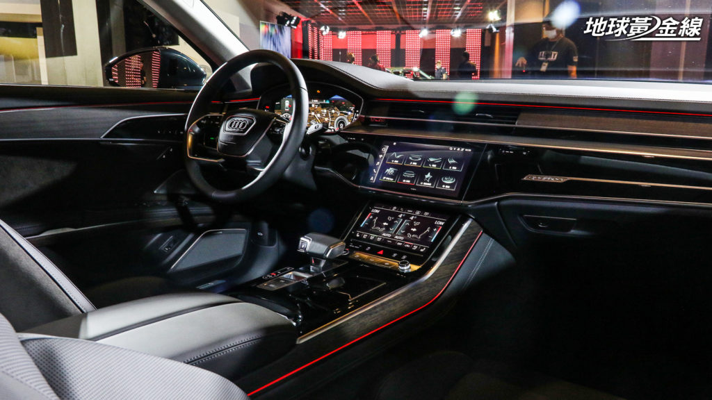 車內則是盡可能將Audi配備全數植入,包含電動調整多功能方向盤、換檔撥片、感應式鑰匙、12.3吋Audi Virtual Cockpit全數位虛擬駕駛艙 (A8 L 55 TFSI quattro享馭版標配Audi Virtual Cockpit Plus版本) 、環艙多彩氣氛燈、後窗電動遮陽簾、後擋電動遮陽簾、電動輔助車門關閉、Valcona真皮座椅、雙前座電動調整座椅、雙前座通風加熱功能、雙後座電動調整座椅、雙後座加熱功能,還有4區恆溫空調等,都是全車系標準配備。A8 L 55 TFSI quattro享馭版更進一步升級中控台高亮澤黑色按鍵、雙後座通風座椅,還有後座5.7吋OLED智聯控制面板等,給予更尊榮享受。