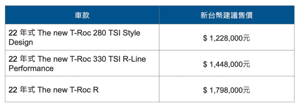 我們上個月才前往東部試駕體驗新車的產品競爭力,VW Taiwan在今日(5月12日)正式發表了小改款T-Roc全車系的陣容編成。除了首批早鳥優惠已銷售一空的280 TSI Style Design與330 TSI R-Line Performance,分別以跟預售價相同的122.8萬跟144.8萬上市之外,消費者敲碗已久的旗艦車型T-Roc R,也以179.8萬的售價在台銷售,第一批150輛的T-Roc R車主還可免費獲得專屬NFT!