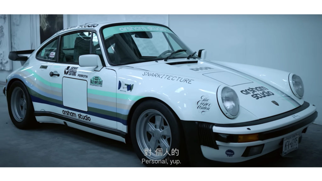 余文樂與Daniel Arsham兩個人一見如故,或許是因為喜歡的東西都不離賽車、Porsche跑車、藝術品等…,所以十分有話聊。Daniel Arsham也展示了一輛自己的930 Turbo作品,這款車上滿是Daniel Arsham曾經合作過或者欣賞的品牌,而這些Logo全部都是由手繪的方式繪製在車體上。