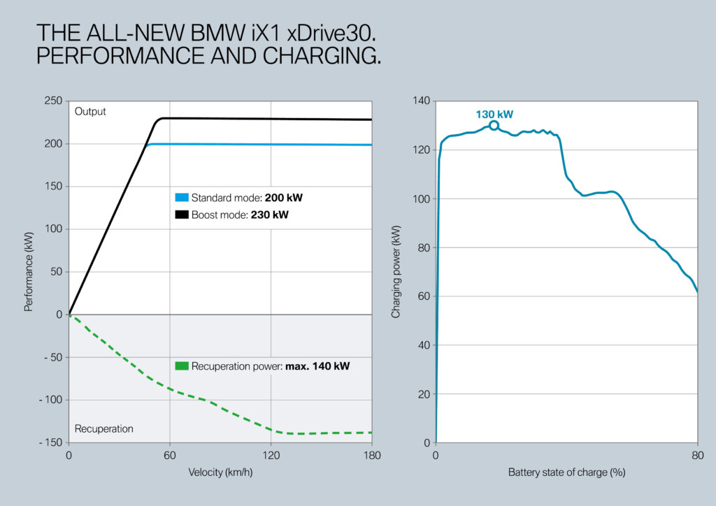 iX1 xDrive30配置的馬達在一般行駛下具備268匹馬力(200kW)/50.4公斤米扭力輸出,急加速會額外增加30kW輸出功率,使馬力值提升至313匹(230kW),原廠測試0~100km/h加速僅需5.7秒、極速180km/h。iX1最大動能回充功率有140kW的表現。