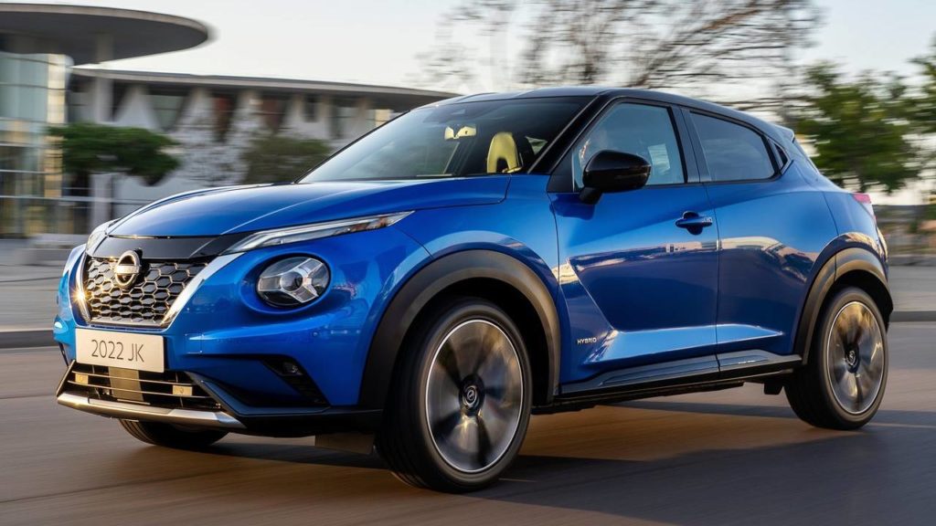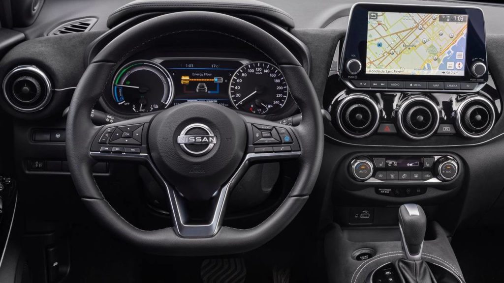 Juke Hybrid外觀設計上,採用重新設計的水箱護罩以及全新樣式17吋鋁圈(或可選配Ariya的19吋樣式)都是為降低風阻而生,另外還有新式廠徽與Hybrid銘牌傳達油電身分。內裝變動在於儀表板取消轉速表,並且可顯示油電系統運作情形,也因為在底盤設置鋰電池,使得後行李廂空間比Juke汽油版少了68公升,容積剩下354公升。