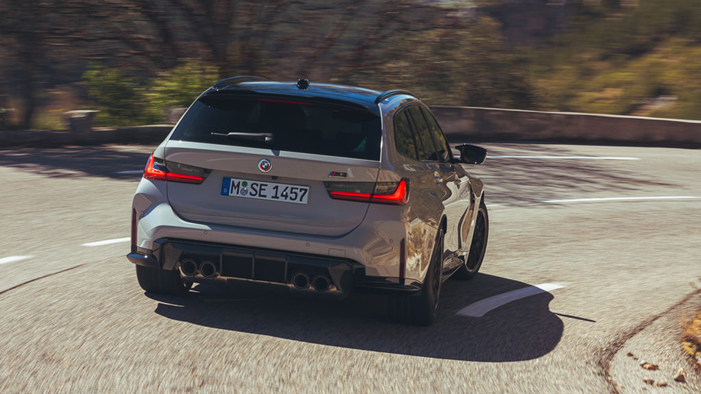 不僅外觀造型設計沿用M3 Competition的設計風格,M3 Touring的動力系統也沿用M3 Competition M xDrive四驅車型架構,所以車尾直接把「M3 Competition」銘牌給貼上,代表引擎是裡頭裝著一具能在6,250rpm輸出510匹最大馬力、2,750rpm至5,500rpm間湧現66.3公斤米扭力輸出的3.0升TwinPower Turbo直列6缸雙渦輪增壓引擎,而這也是新款M4 GT3的動力心臟基礎。與其搭配的,則是配備有Drivelogic,整合3種換檔模式的8速M Steptronic手自排變速箱,還有整合後軸Active M差速器的M XDrive全時四輪驅動系統。