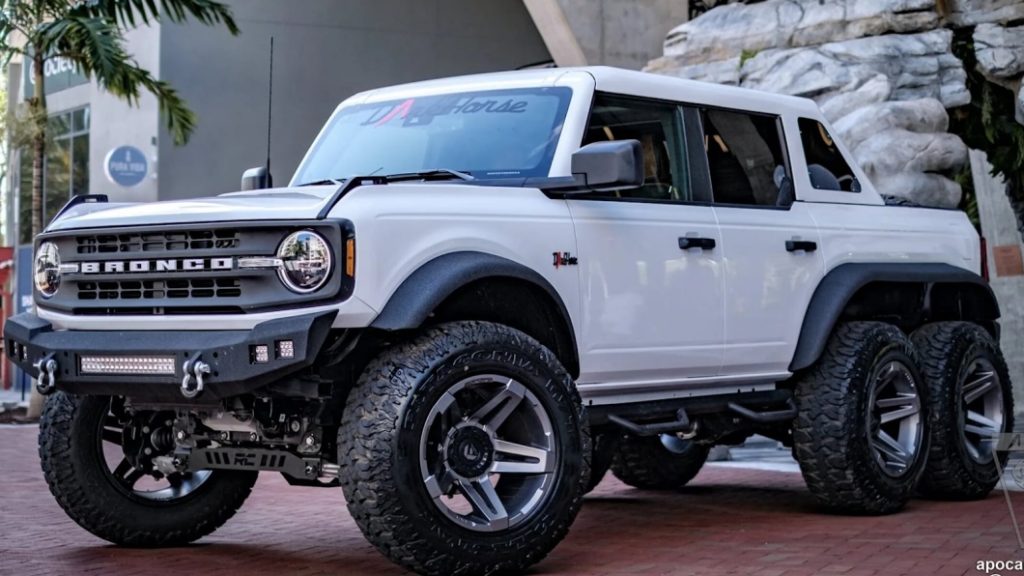 美國改裝品牌Apocalypse打造了不只一輛六輪猛獸,包含了Ram 1500 TRX以及Bronco都擁有6X6的改裝版本,前者配置了6.2升V8機械增壓引擎,最大馬力來到702匹,售價更是高達18萬美金,但對於這種怪物來說這樣的價格似乎沒有太貴,而後者由Bronco改裝而成的六輪皮卡是使用2.7升渦輪增壓引擎,擁有400匹最大馬力,幾乎與Bronco Raptor相同,而懸吊經過特別改裝之後,看起來更是霸氣逼人。