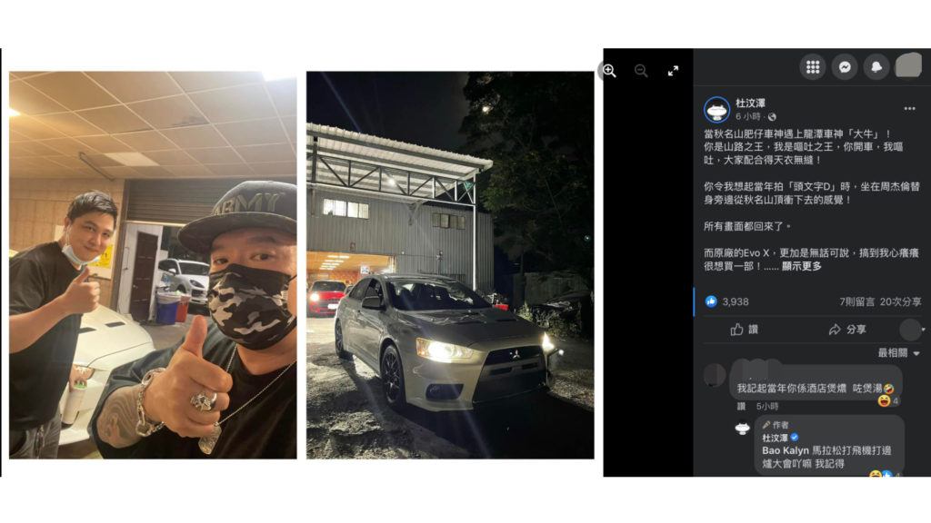 日前杜汶澤在自己的臉書粉絲專頁中上傳了一張照片,並且發文講述自己搭了朋友的Mitsubishi Lancer Evolution X,讓他回想起當年拍攝《頭文字D》,坐在周杰倫替身旁邊從秋名山頂衝下去的感覺,使他感到十分懷念。
