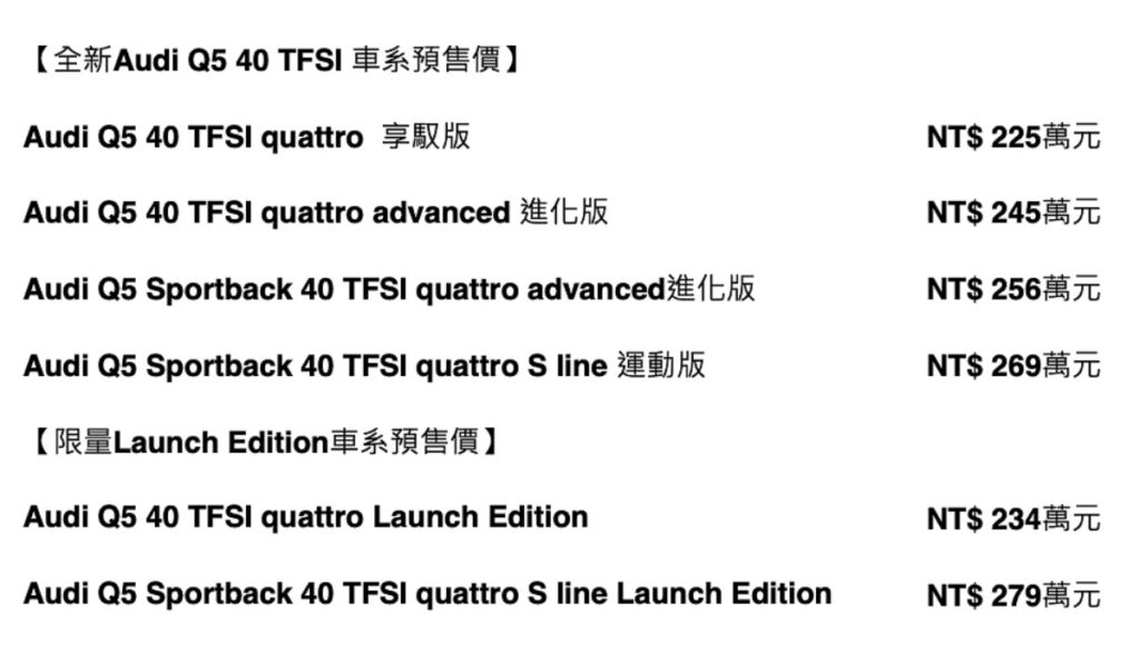 四環品牌以全方位主被動安全配備與創新科技設計,打造Audi Q5全車系多達8種車型給家庭購車族群更多元的選擇,不論在安全科技、車型尺寸、舒適機能或動態操駕取向上,給予國內消費者豐富的四環駕馭樂趣,近日更是導入全新動力Audi Q5 40 TFSI quattro,以甜蜜價格帶讓人輕鬆入主享受四環魅力,推出預售即受到踴躍詢問,並於當月斬獲大量訂單,全車系陣列熱銷中。