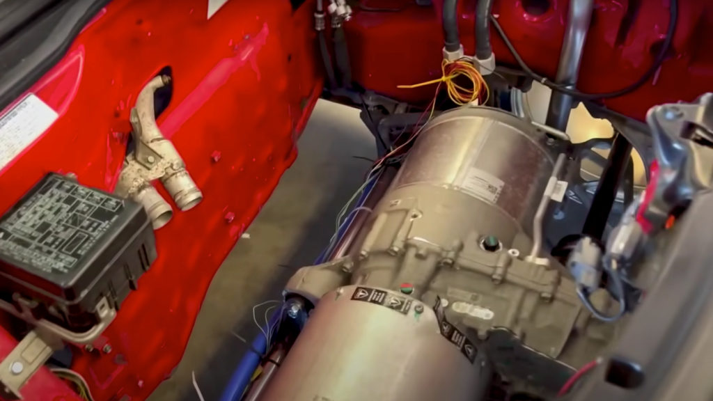 其實Jeff在接受訪問時,他的電動NSX還沒有正式完工,打開引擎可以見到來自Tesla Model S的電動馬達,只不過光是要植入電動馬達系統,就必須對車體進行切割。而電池方面則是暫時選用來自Toyota Prius的電池組,不過由於這組電池的容量與效能都不盡理想,所以Jeff也坦承裝上它之後僅能夠稍微移動車輛,他也將物色效能更好的電池來驅動車輛。