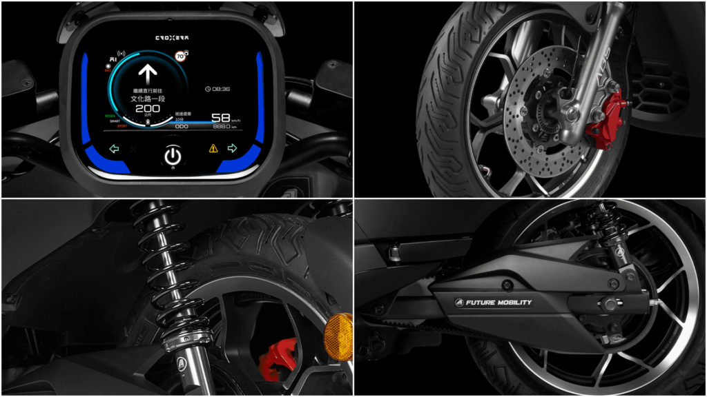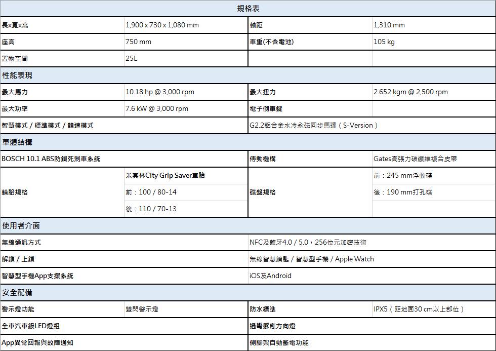 動力單元方面,新車搭載G2.2鋁合金水冷永磁同步馬達(S-Version),可於3,000轉輸出10.18匹最大馬力、2,500轉輸出2.652公斤米扭力,並提供智慧模式、標準模式或競速模式切換,0~50km/h加速僅需3.9秒。宏佳騰為其懸吊系統加入無段可調氮氣後避震,以有效吸收路面震動強化騎乘穩定性。