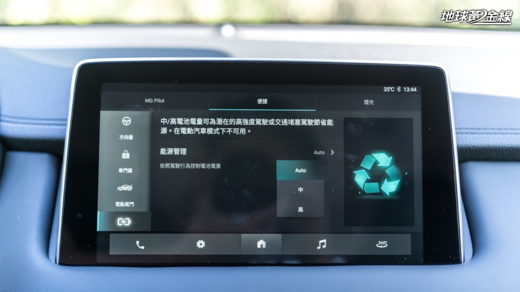 HS PHEV相比HS 1.5T,少了方向盤左下方的Super Sport按鍵與Drive Mode動態模式選擇,取而代之的則是排檔桿左側的EV按鍵,來讓駕駛在EV純電模式與Auto智慧充電模式之間做切換。如果駕駛進中控螢幕選單調整的話,還會發現Auto智慧充電模式還會分成自動、強制充電電量:中與強制充電電量:高三個檔位,這三者主要差異在於引擎介入輸出以及幫助電池充電的時機點,選取強制充電電量:高且電池電量在35%的情況下,引擎就連靜止/怠速時都會積極運轉來幫助充電;反之自動模式下,即便電量相當低也不太常遇到引擎在車輛靜止時幫助電池充電的情況。
