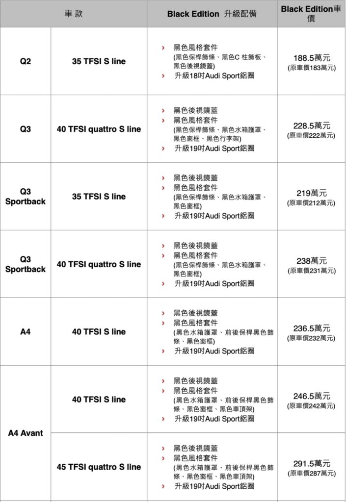 近期調整了23年式新車配備與售價編成的Audi Taiwan,其實還沒放緩新車戰力升級工程的腳步,在今日(10月13日)宣布為Q2、Q3/Q3 Sportback、A4 Avant、A5 Sportback、TT、A6/A6 Avant與Q8等車系的S line車型,推出了升級黑色外觀套件甚至是輪圈的Black Edition新車,讓消費者有更具競爭力的車型能夠選擇。