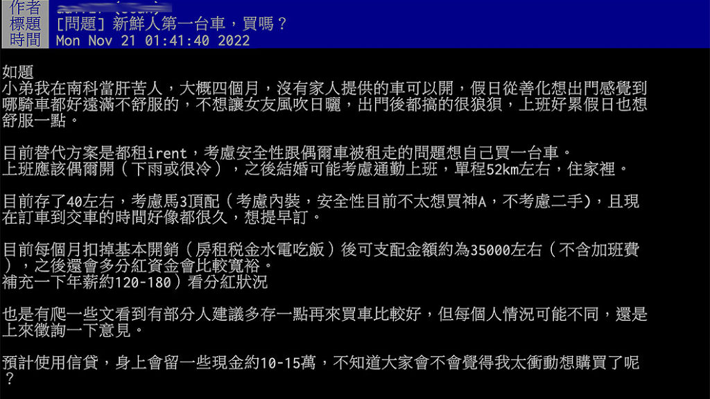 PTT一名網友在南科上班,到職大約4個月,雖然平常就住在善化一帶,距離南科很近。但假日出門只能騎車,女友也只能跟著日曬雨淋,而且去遠一點的地方也格外辛苦,想開車只能使用短租服務。而且未來結婚後可能會住回家裡通勤上班。所以動了買新車的念頭,手頭還有40萬元存款,年薪120萬元到180萬元之間,買什麼樣的車比較適合?