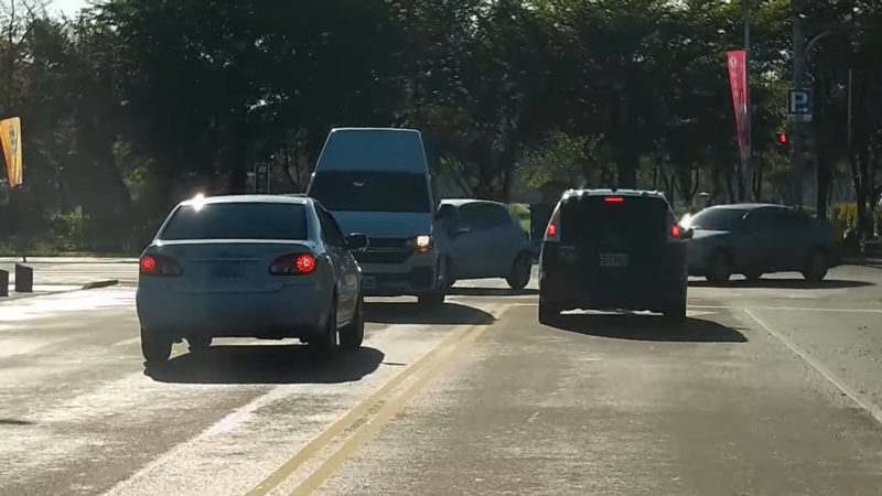 過大約1分鐘後,Corolla Altis行駛於成興路上,見到路口紅燈卻完全沒有停下,直接往左前方開進富農路一段,連續兩個違規行為,引來網友各式各樣嘲諷式留言:「城裡來的 : 因為在大城市,車站前面都是單行道」、「還知道(逆向)要回來,很多都是比對方凶的。」、「最後的闖紅燈,其實見怪不怪了,很多三寶都以為紅燈就是可以左轉的意思」。