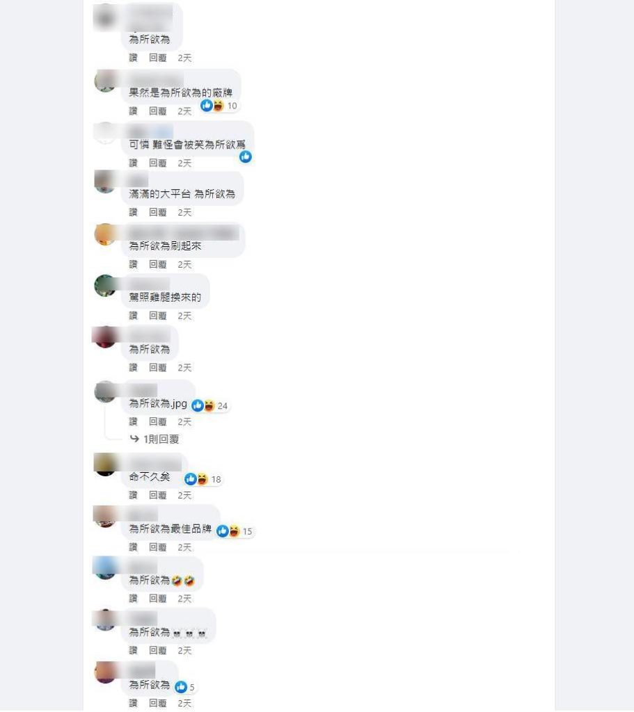 其餘4字心得像是:「正常發揮」、「夏天的瘋(因為拍攝的車主正聽著『夏天的風』這首歌曲」、「一路好走」、「逆流而上」、「隨心所欲」、「路我家的」、「上帝保佑」等等……而最多網友留言的就是「為所欲為」,還認為果然三寶就是偏愛某些特定品牌。