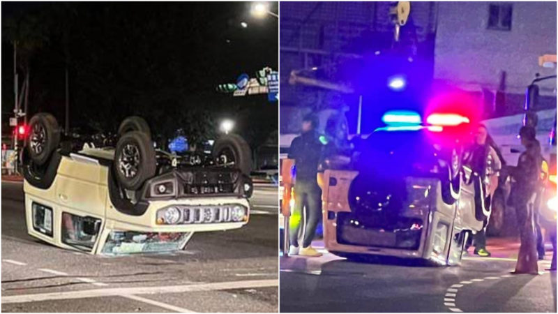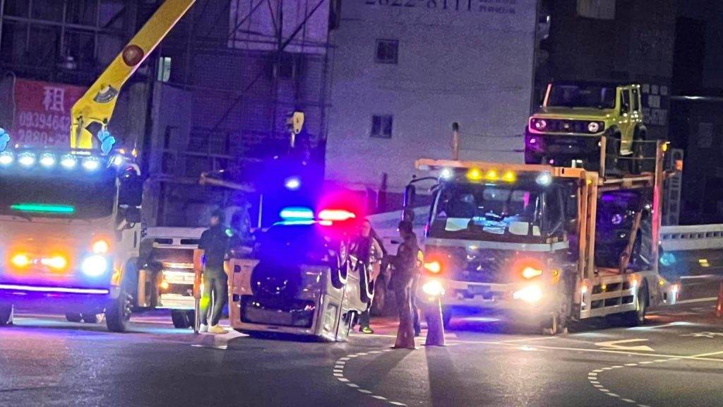 事情發生在2023年1月4日的台北市士林區,一輛汽車載運車載著3輛還沒領牌的Suzuki Jimny行經百齡橋要送往北投展示中心時,疑似未將車輛固定妥當,結果34歲葉姓駕駛遇到紅燈緊急煞車時,位於上層最前方的米黑色Jimny直接前滾翻,車頂朝地重摔,形成四輪朝天的翻車樣。