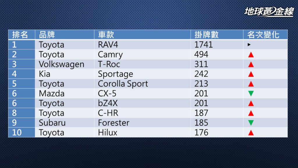 其他入榜名單則是共有311輛新車領牌的Volkswagen T-Roc,位居RAV4與Camry之後名列第三。上市以來都面臨缺車狀態的Kia Sportage在1月份則有相對大量的車源來臺,以242輛掛牌數拿下進口車排行榜第4名。另外,則是與bZ4X同樣繳出201輛掛牌數的Mazda CX-5,並列第6名。最後一款「非Toyota」車款則是Subaru Forester,單月掛牌數為185輛。