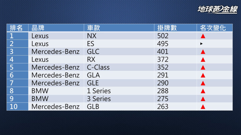 而且Lexus的好表現還不僅只在NX車系,ES、RX也都名列前茅、分別繳出495輛以及372輛掛牌成績,分別拿下第二名以及第四名位置,前五名當中Lexus就搶下三席。Lexus品牌入榜常客中只有UX車系表現相對較不亮眼,220輛掛牌數並無法擠進前10名,以第12名成績作收。
