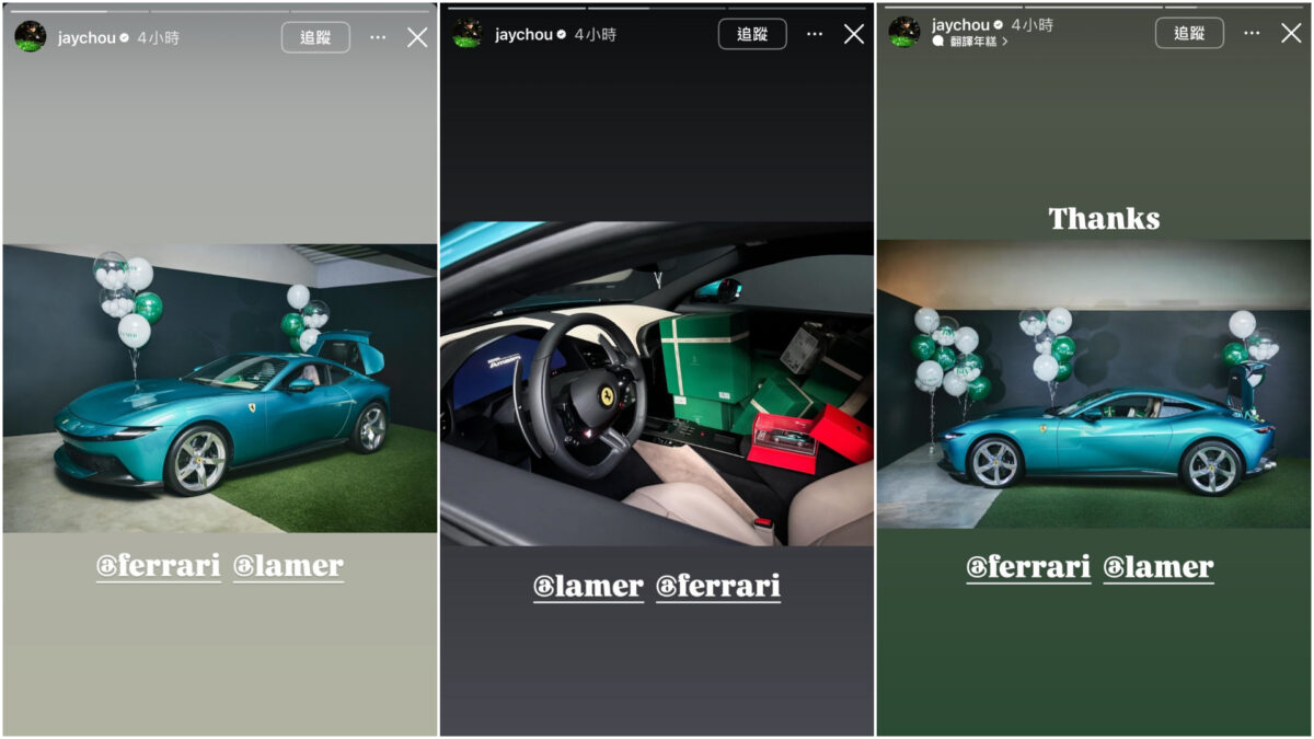 周杰倫近日在個人IG限時動態分享多張法拉利(Ferrari)全新車款「Amalfi」的照片,特別引起關注的,是他同時標記了代言的「Ferrari」與高端保養品牌「La Mer海洋拉娜」,還寫了「Thanks」。而這輛車的外觀呈現淡淡的海洋藍綠色調,宛如呼應La Mer的品牌意象,也讓外界紛紛猜測,這是否是一場法拉利與La Mer聯手打造的跨界合作,甚至可能是兩品牌為周杰倫量身客製的「限量禮物」。