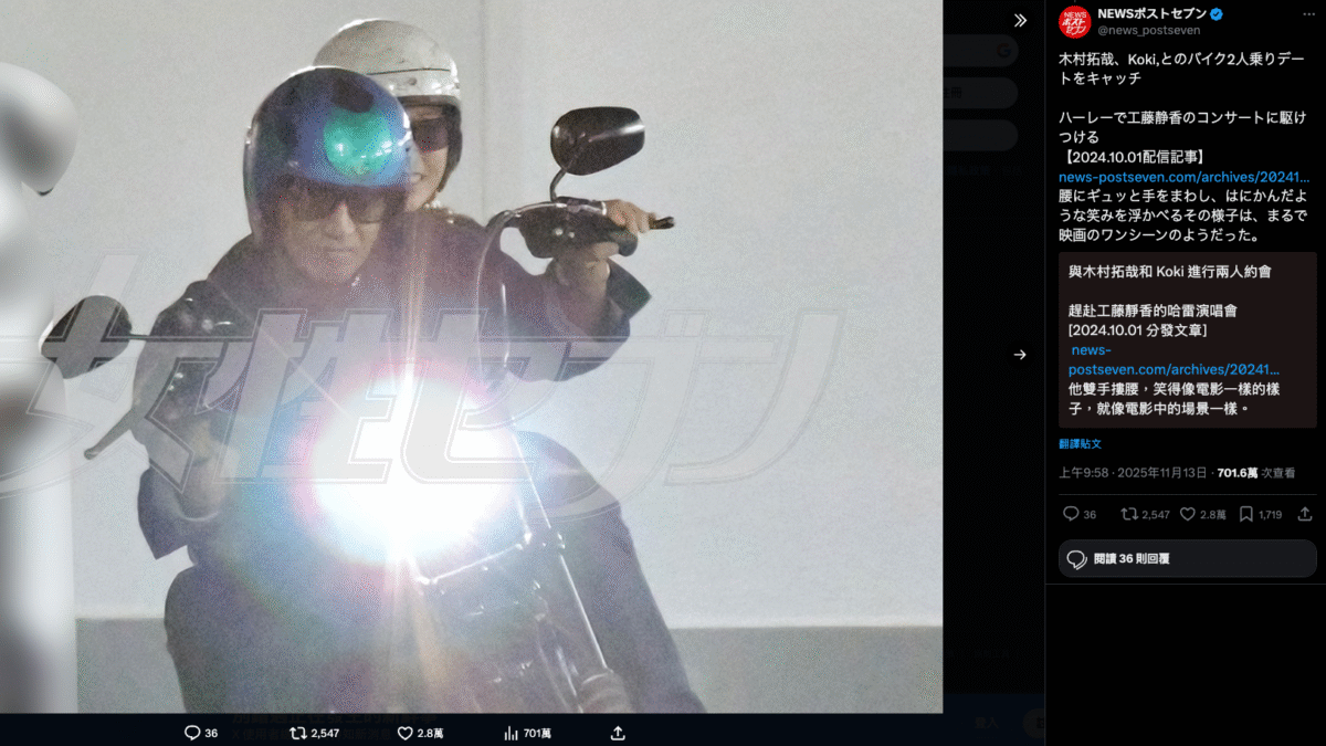11月13日是日劇天王木村拓哉的生日,今年正式迎來53歲。兩位女兒木村心美與木村光希,也分別在社群平台上曬出全家合照,為爸爸獻上祝福,再度引發粉絲熱烈討論。然而比起生日照片,近期在X上瘋傳的另一張畫面,更讓車迷和網友們大呼「實在太帥了」!