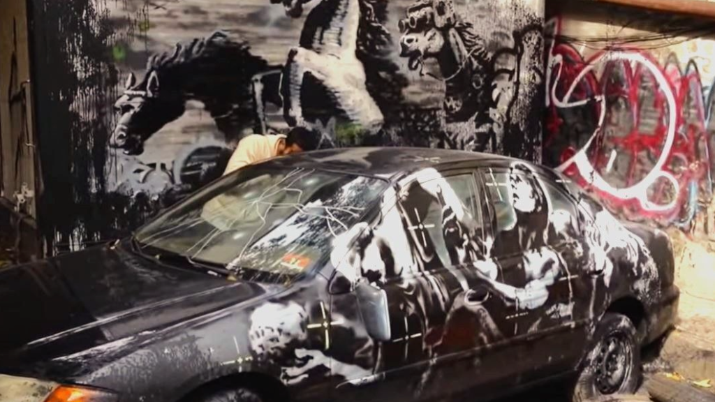 原來這扇門其實是街頭藝術家Banksy用來作畫的畫紙,窗戶上面還貼有Mazda原廠貼紙。而上面的塗鴉作品名稱是在2013年於紐約市創作的《瘋馬》,主要描述陰森的戰爭場景,上面可以見到馬匹奔騰、人們抬頭仰望,訴說戰爭的無情與殘酷。