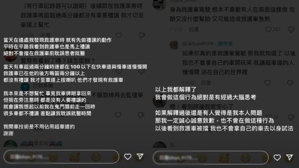 沒想到影片曝光吸引大批網友留言:「三寶裝正義」、「我自己也是開救護車的…但我也很無解妳違法又沒沒辦法鳴笛,那妳怎麼開路」、「從彰化擋到嘉義==」、「超速合理化的行為,我笑了」、「看不懂妳在幹嘛」、「素質差到難以想像」。指稱女網友的行徑不值得讚賞,而長時間行駛在救護車前方的行為,網友認為女網紅才是擋道的三寶車輛。