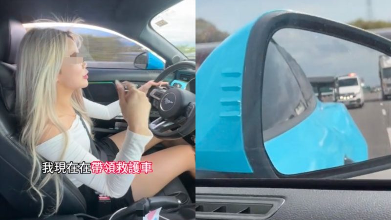 近期再度發生民車阻擋救護車的離譜事件,一名女性網紅駕駛Ford Mustang跑車行駛在內線車道,不僅長時間駕駛在鳴笛閃燈的救護車前方,過程中還自稱幫助緊急車輛「開道」,多次按喇叭要求其他內線車道汽車駛離,反酸其他駕駛三寶並將影片上傳網路。然而,影片曝光後引來大批網友不滿,紛紛留言砲轟女網紅,直言「活在自己世界裡」。