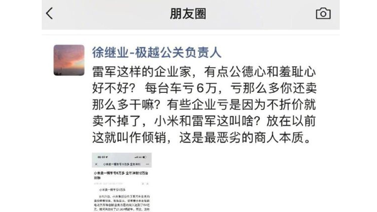 然而,小米汽車的虧損消息迅速引發了其他車企的不滿。中國大陸車企「極越」的公關負責人「徐繼業」在微信朋友圈發文,痛批雷軍的經營策略。徐繼業8月22日在微博朋友圈發文:「雷軍這樣的企業家,有點公德心和羞恥心好不好?每台車虧6萬,虧那麼多你還賣那麼多幹嘛?有些企業虧是因為不折價就賣不掉了,小米和雷軍這叫啥?放在以前這就叫作傾銷,這是最惡劣的商人本質。」