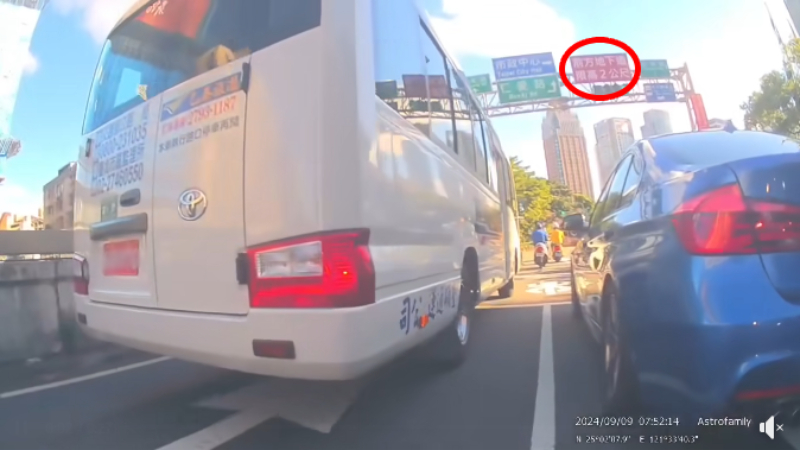 事後,小巴士後方車輛的行車紀錄器畫面也曝光。只見小巴士原先停等紅燈,並待綠燈後向前行駛,沒想到下秒進入地下道前車頂就撞上地下道天花板,裝設的防撞措施也當場掉落,砸到後方機車騎士,小巴士當場向左邊停靠車輛,但有擦撞車側情形,並在路旁等待救援。