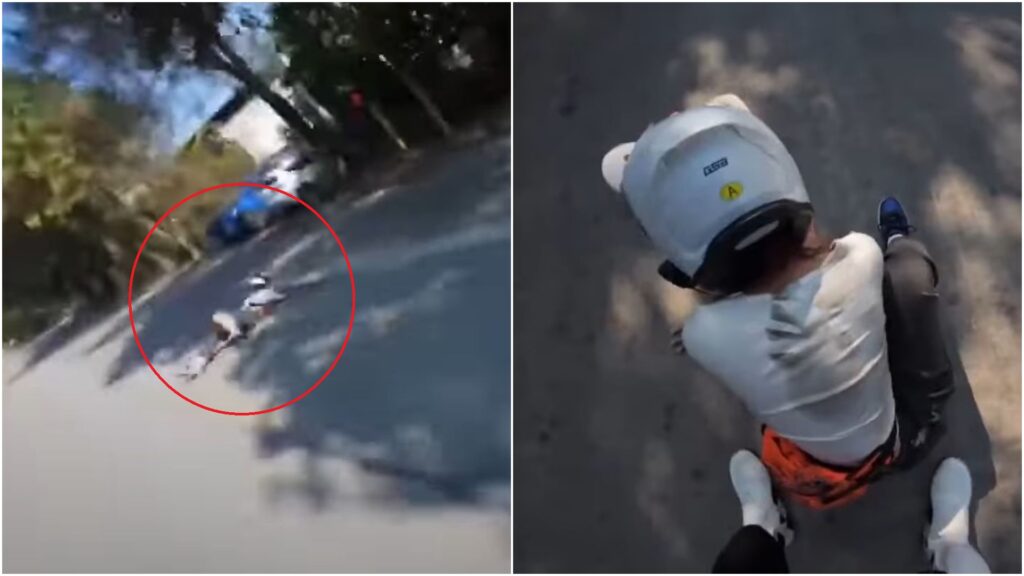 男騎士接著減速把車停到路邊,再往回跑向女友,但第一時間並沒有詢問傷勢與狀況,劈頭就是「媽的!讓妳一直抱緊我,妳怎麼就不聽呢?」接著將她拖至路邊,過程可見女友衣服都磨破,痛得在地上說不出話,但男騎士卻喊「我真的對妳很無奈」。