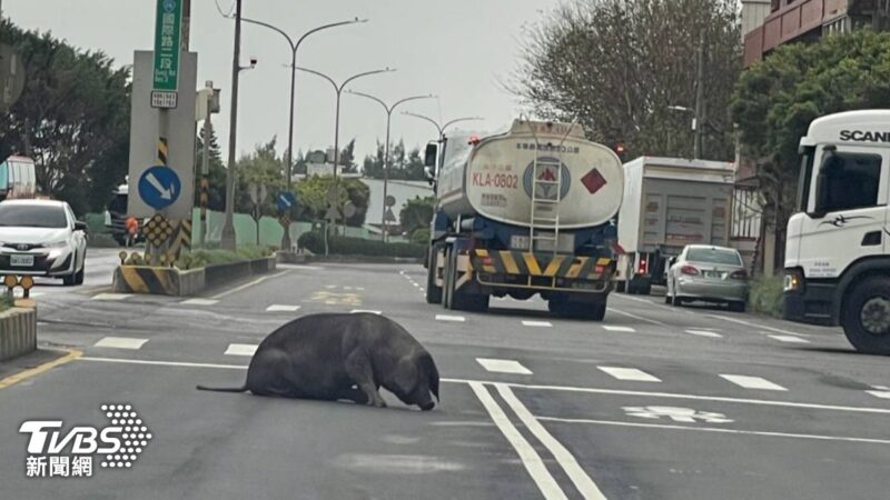 大園分局指出,有員警昨日上午8點行經國際路二段與中央路口時,赫然發現一隻大黑豬呆坐在內線車道,路旁車輛見狀紛紛閃避,由於當時正值上班尖峰時刻,為維護用路人安全,員警立即上前用巡邏車掩護,並開啟警示燈疏導車流。