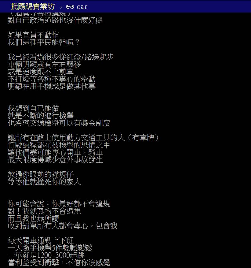 - 「現在路上違規行為太普遍,若有檢舉獎金,每天通勤順便檢舉就能嚇阻更多違規。」