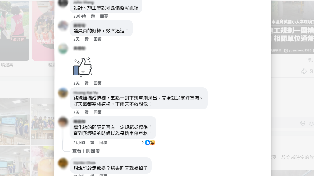議員鄭宇恩的臉書貼文一發,立刻引起網友討論。網友們紛紛留言表示「設計、施工想說地區偏僻就亂搞」、「想說誰敢走那邊?」、「真的很誇張」、「槽化線的間隔是否有一定規範或標準?寬到我經過的時候以為是機車停車格!」、「難怪經過時一頭霧水」,甚至有人直言「路線被搞成這樣,五點一到下班車潮湧出,完全就是塞好塞滿。好天氣都塞成這樣,下雨天不敢想像!」