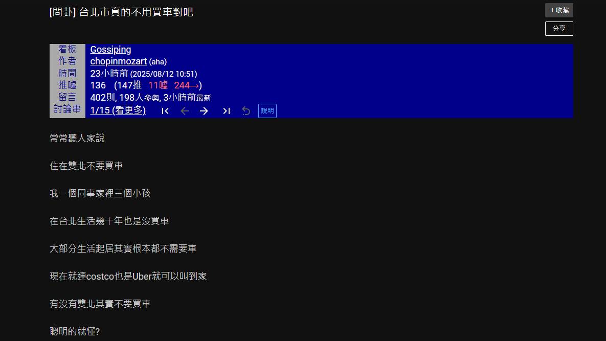 原Po在貼文中表示,常常聽人家說,住在雙北不要買車。他分享,身邊的同事家中有三個孩子,在台北生活數十年從未購車,日常所需皆能透過公共交通滿足。接著,他補充「現在就連costco也是Uber就可以叫到家,有沒有雙北其實不要買車,聰明的就懂?」因此,他發文詢問網友,在雙北生活不買車是否才是更聰明的選擇。