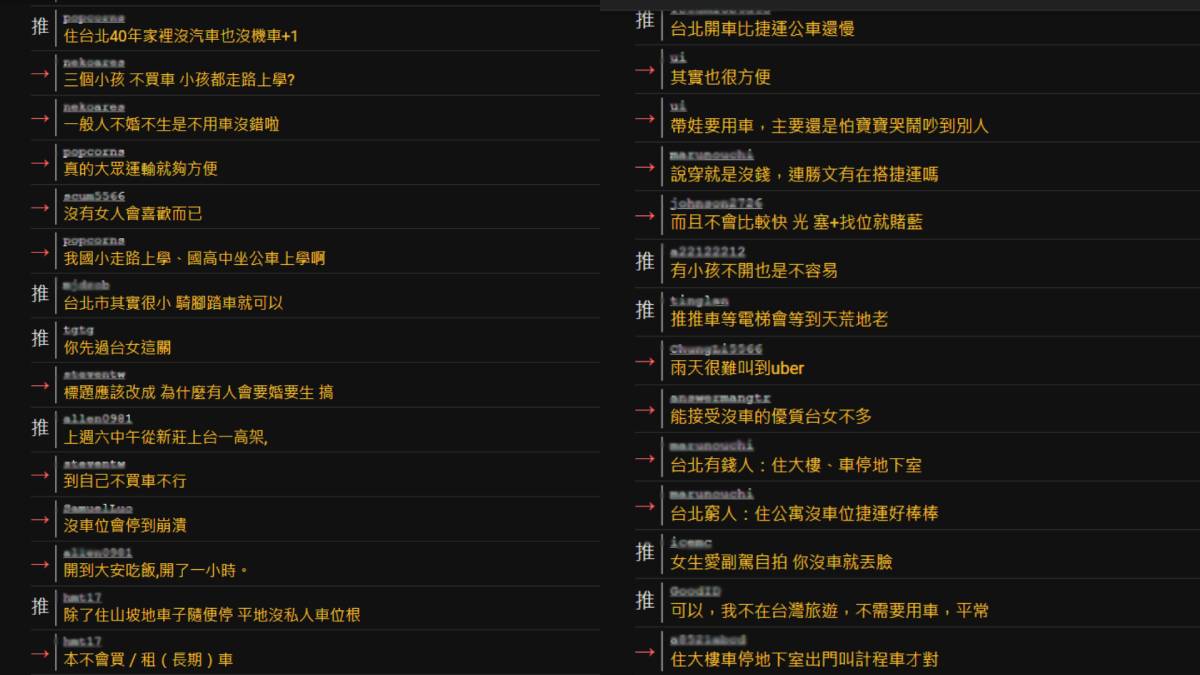 然而,也有網友持不同意見,認為「新北還是需要」,還有人直呼「買不起不是不用買」、「是沒錢不用開車」、「真的就是不夠有錢!畢竟持有成本比較高」、「說穿就是沒錢,連勝文有在搭捷運嗎」。另外,還有網友提到,「帶娃要用車,主要還是怕寶寶哭鬧吵到別人」、「有小孩不開也是不容易」、「有小孩還是要有車啦」。