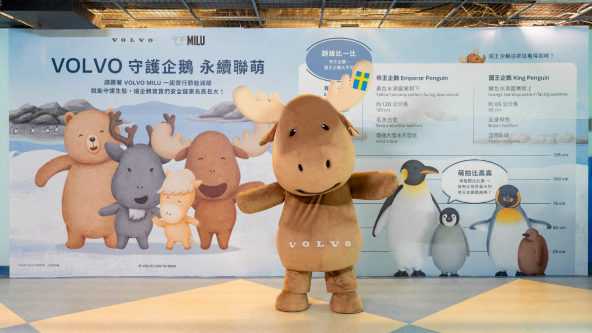 今年,Volvo與臺北市立動物園再次合作,於企鵝館內外空間獨家打造「Volvo守護企鵝 永續聯萌」主題互動展覽。企鵝館內與館外以Volvo的吉祥物Milu與他的好友們為主題,設置多面萌趣兼具教育性質的壁面導覽解說、造型立牌等視覺佈置,讓大小朋友可以和企鵝比身高、拍照打卡,在探索國王企鵝與黑腳企鵝的生活樣貌過程當中,輕鬆吸收與動物保育、減碳行動相關的永續知識。