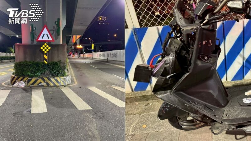 畫面顯示,昨日晚間7時許,洪男騎車沿新莊區新北大道四段往三重方向行駛,正當其穿越中原路口時,機車突然失控向左偏移,最後猛力撞上左側橋墩,讓洪男當場彈飛重摔在車道上,機車零件也因強大的撞擊力道噴濺四散,所幸當時後方沒有來車,洪男未再遭到撞擊。