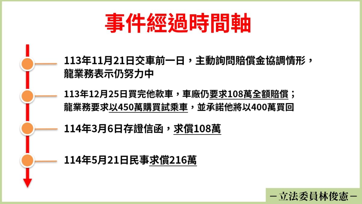 林俊憲指出,目前國內並無「試駕定型化契約」,一旦發生爭議,消費者常處於弱勢,容易被車商藉機索賠。他提出三項改革訴求: