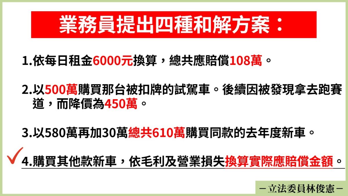 更令人訝異的是,這些資訊與一個月後正式寄出的罰單內容完全一致。由於超速逾40公里依法須吊扣車牌6個月,業務要求陳情人必須「買車或賠償」。據了解,業務給出4個賠償條件: