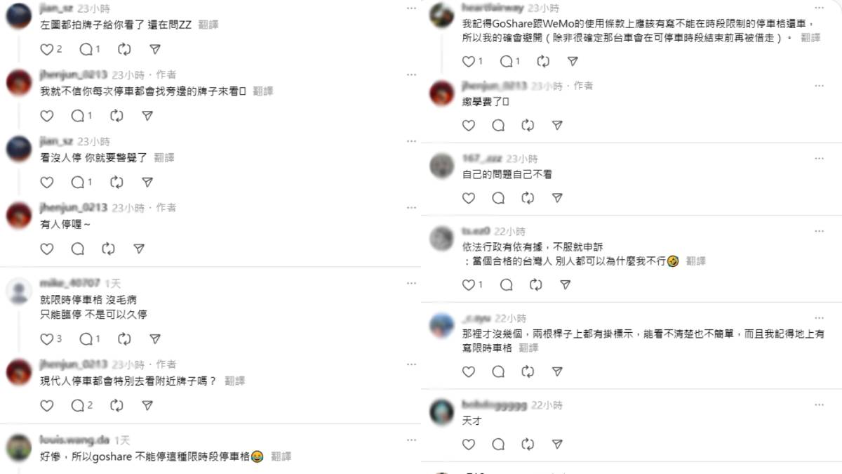 事件曝光後,不少網友認為「左圖都拍牌子給你看了,還在問」、「就限時停車格沒毛病,只能臨停不是可以久停」、「要享受方便的騎乘共享電車連個停車位都懶得找嗎?停車都沒在看指示牌有位就停違規被開單剛好」、「自己的問題自己不看」。另外,也有網友表示,「好慘,所以goshare不能停這種限時段停車格」、「我記得GoShare跟WeMo的使用條款上,應該有寫不能在時段限制的停車格還車,所以我的確會避開」。