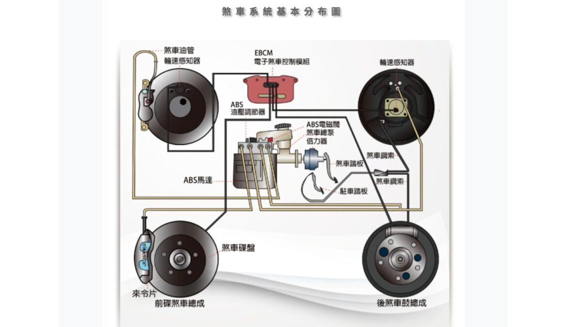 當駕駛踩下煞車踏板,力量會透過真空倍力器與煞車油壓力透過總泵、煞車油管傳送到四輪分泵,接著再由夾式卡鉗或鼓式機構產生摩擦力來達到減速目的。