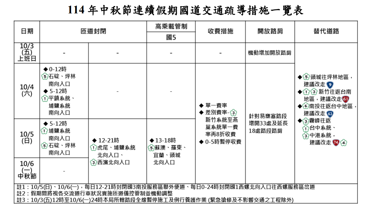 高公局認為,中秋節屬於民俗性節日,連續假期除返鄉亦會有旅遊車潮。其中,中秋節首日、第2日以南向車流為主,第2日、第3日以北向車流為主,國道將有顯著車潮。高公局特別針對國道5號祭出高乘載管制措施: